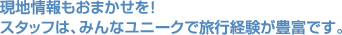 過去の旅行経験に加え、今でもスタッフが海外旅行に行き現地を訪れ、